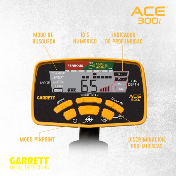 A diferencia de su hermano pequeño, el Garrett ACE 200i , este detector tiene 5 modos de búsqueda. Existen los siguientes modos de búsqueda: